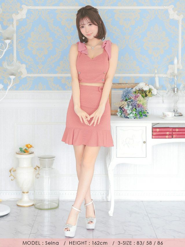 上品で可愛いセットアップドレス♡ [SALE] ノースリーブ リボン ダブルボタン ウエストサイドベルト ストレッチ 裾フリル セットアップ 谷間魅せ タイトミニドレス (Sサイズ~XLサイズ) (聖菜/キャバドレス着用)