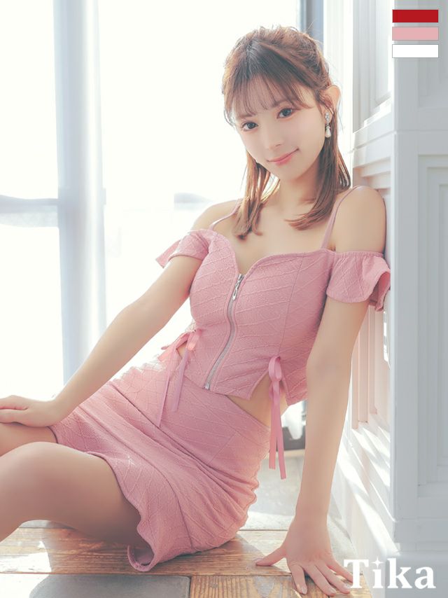 3. [SALE] フロントジップ肩出し 二の腕カバードロストリボンセットアップストレッチ裾フリルタイトミニドレス (Sサイズ~XLサイズ) (黒崎みさ/キャバドレス着用)