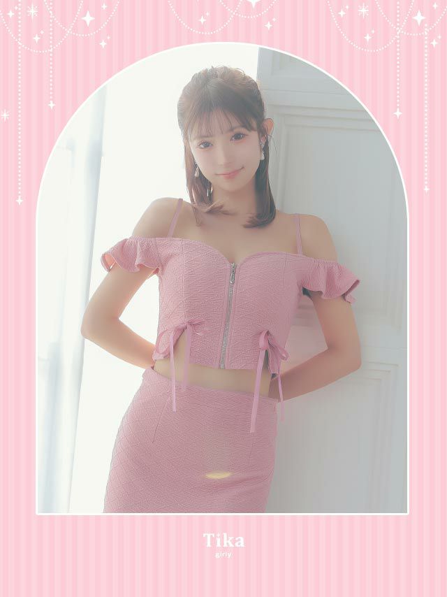 5. [SALE] フロントジップ肩出し 二の腕カバードロストリボンセットアップストレッチ裾フリルタイトミニドレス (Sサイズ~XLサイズ) (黒崎みさ/キャバドレス着用)