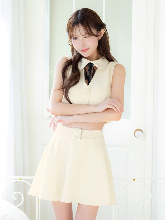 5. ミニドレス Aライン セットアップ ノースリーブ 襟付き ツイード ネックリボン ベルト付き XL アイボリー キャバドレス (聖菜着用) [tk-mds270808]