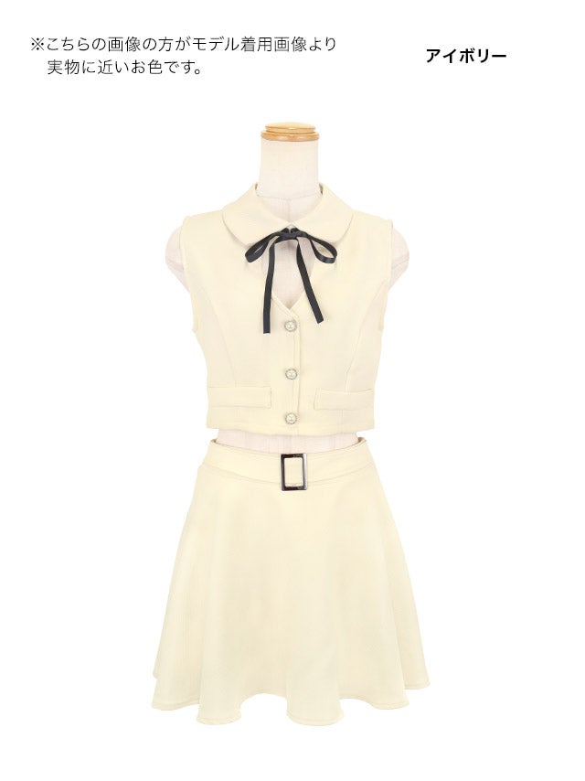2/26新作★清楚で上品スタイルに♪ ミニドレス Aライン セットアップ ノースリーブ 襟付き ツイード ネックリボン ベルト付き XL アイボリー キャバドレス (聖菜着用) [tk-mds270808]