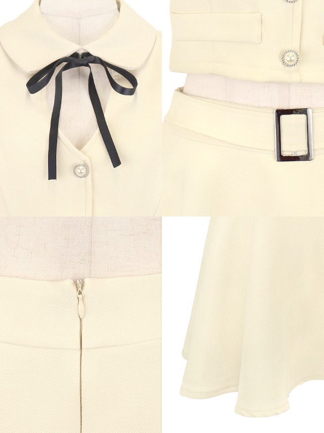 ミニドレス Aライン セットアップ ノースリーブ 襟付き ツイード ネックリボン ベルト付き XL アイボリー キャバドレスのスペック表