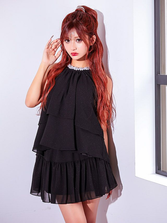 4. ワンピース ミニドレス セットアップ Aライン 上品 ハイネック ホルターネック ネックビジュー バックリボン ビジュー 胸元カバー ティアード フリル シフォン 同伴 (横田未来着用) キャバドレス [tk-mds9008a]