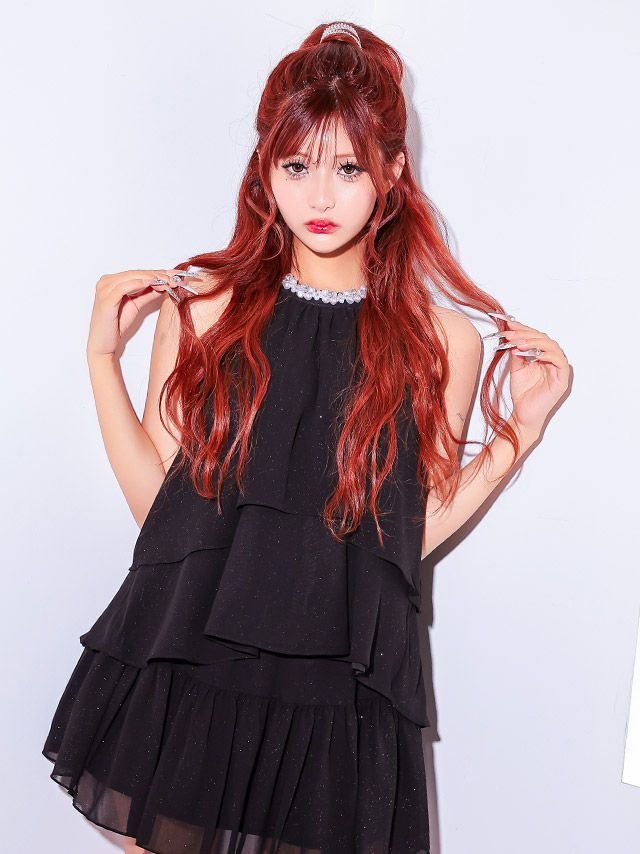 ワンピース ミニドレス セットアップ Aライン 上品 ハイネック ホルターネック ネックビジュー バックリボン ビジュー ティアード フリル シフォン 同伴 (横田未来着用) キャバドレスのスペック表