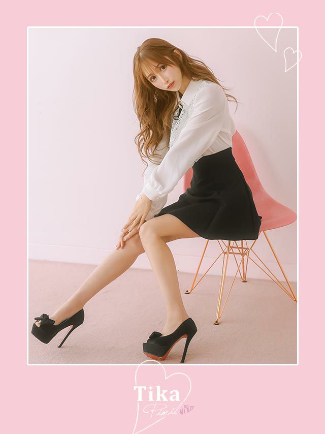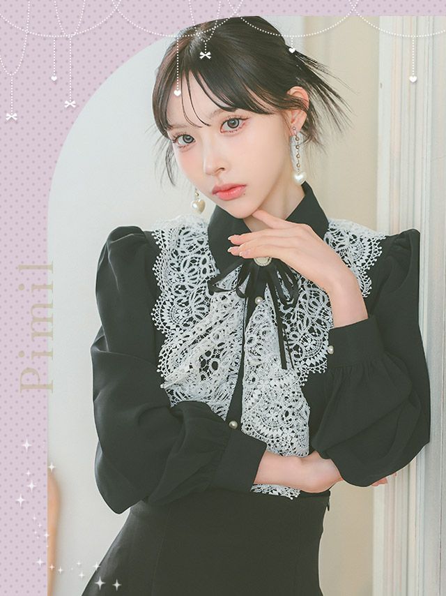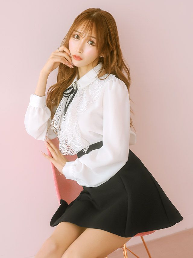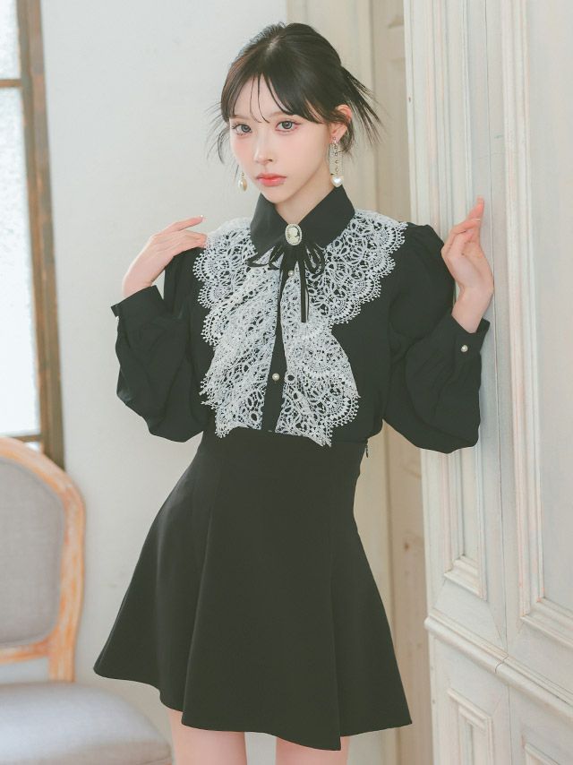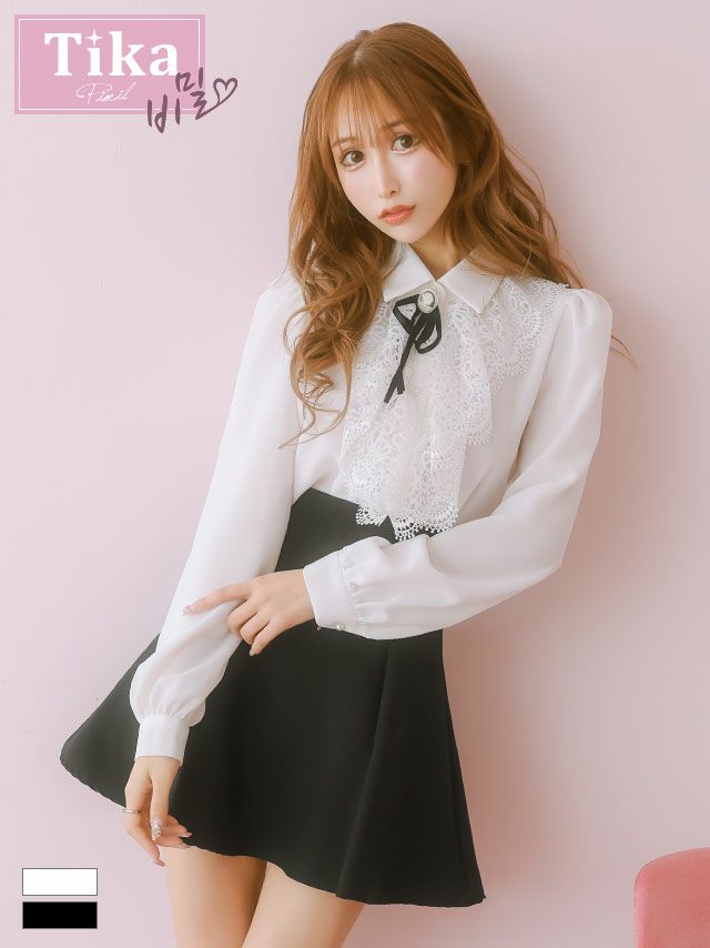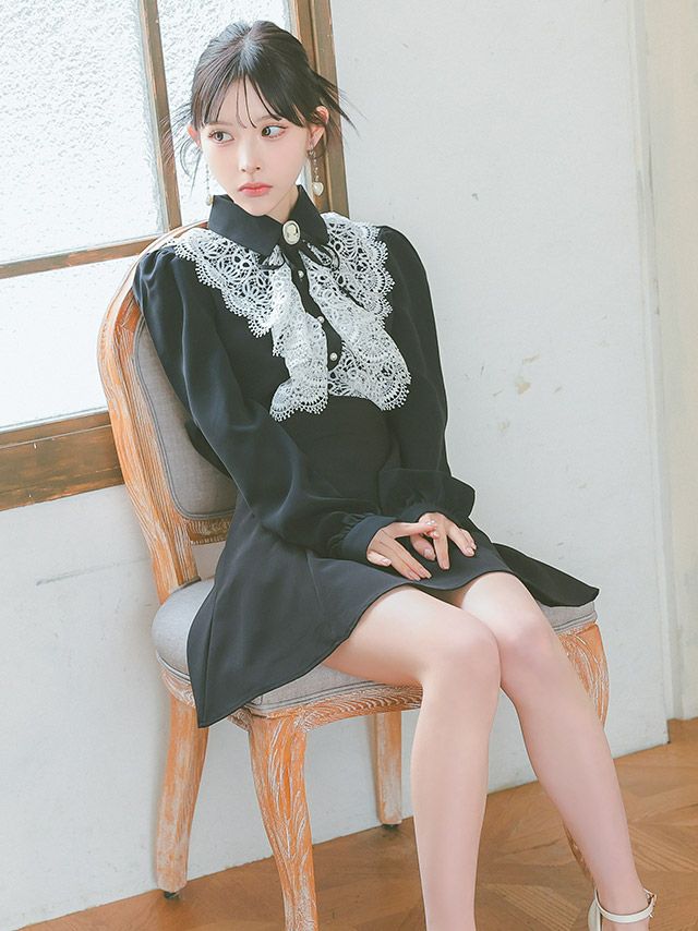 3. [SALE] [韓国ドレス] セットアップ ブローチ付き 長袖 ケミカルレース 襟付き フリル ブラウス スカートパンツ フレアミニドレス (Sサイズ~Lサイズ) (緩苺/キャバドレス着用) [TikaPimil]