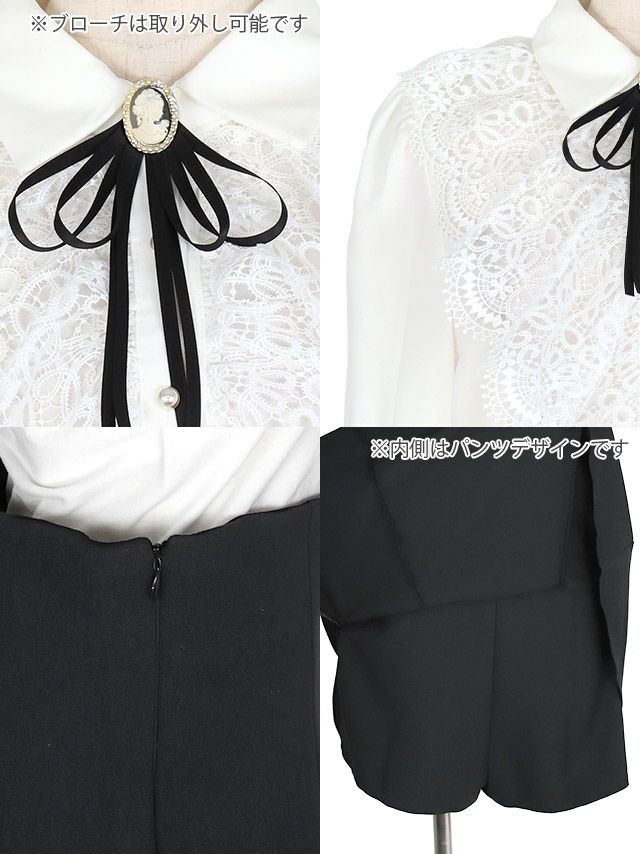 長袖刺繍レースフリルブラウス×ミニスカートパンツブローチ付きセットアップドレスイメージ画像1