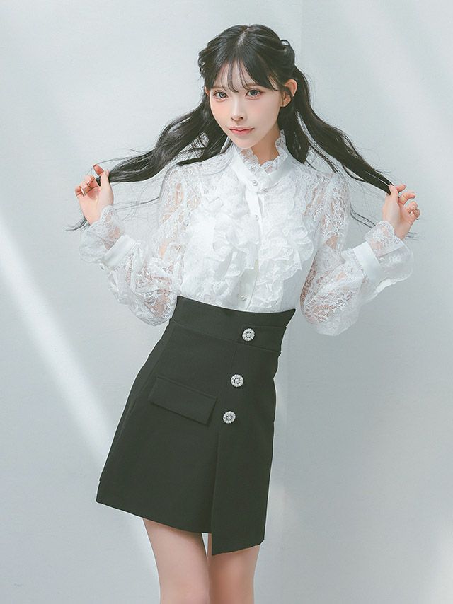 キャバドレス ミニ丈 韓国 キャバドレス Tika ティカ カップ付きキャミソールスタンドネックフリルレース長袖ブラウス×スカートパンツセットアップドレス