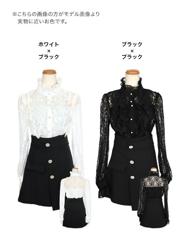 カップキャミソール付きスタンドネックフリル総レース長袖ブラウス×ビジュー付きラップ風スカパンセットアップドレスのメイン画像