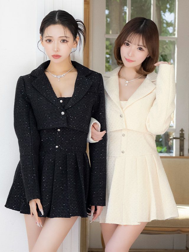 3. ショートテーラードジャケット×フロントボタンプリーツフレアミニワンピースツイードセットアップスーツ (Sサイズ/Mサイズ) (せいせい/キャバスーツ着用)