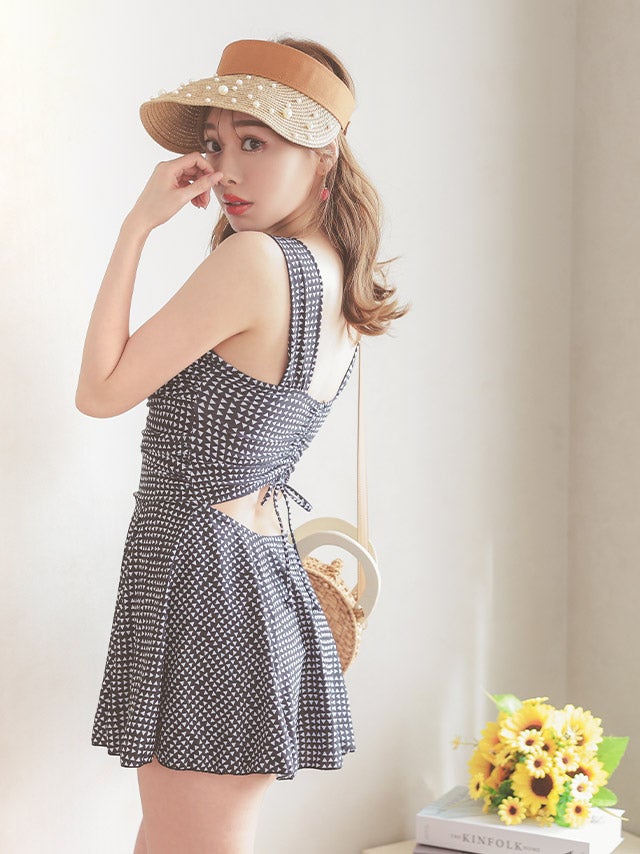 3. [水着] ワンピース 幾何学柄 スカート 体型カバー ドロスト バックシャン レトロモダン ブラック 黒 モノトーン ビキニ (久保七瀬着用) [tk-swwy2210]
