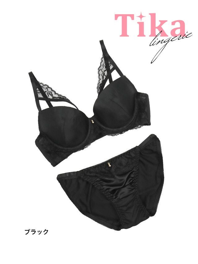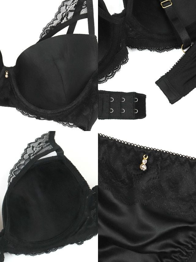 誘惑的な谷間を演出♡ [勝負下着] ビジューチャーム付き バストカット レース サテン ワイヤーカップ ブラジャー ショーツ 2点セット