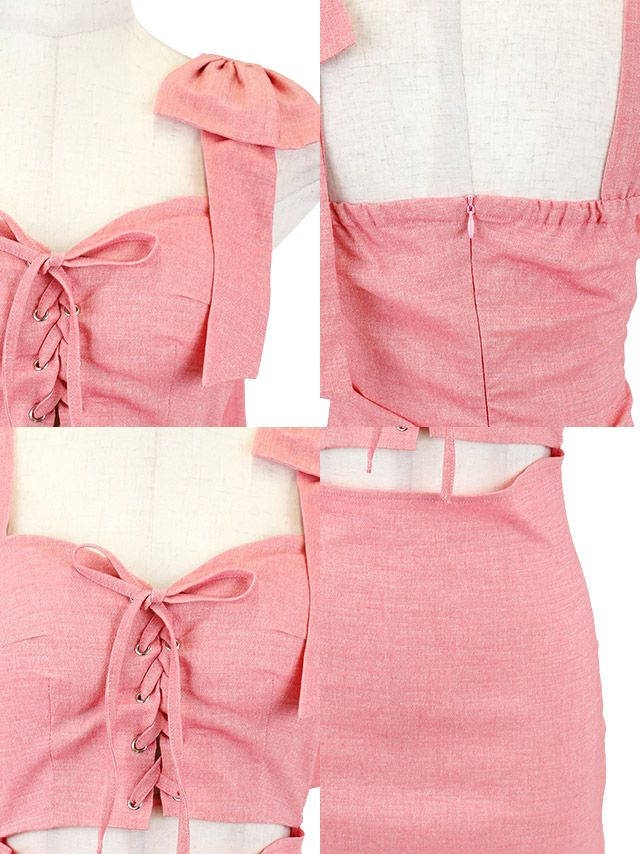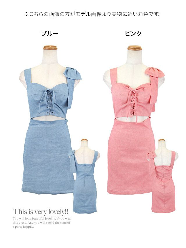 女の子らしいリボンショルダーで小顔魅せ♪ [韓国ドレス] タイトミニドレス 谷間 シンプル ノースリーブ ウエストカット レースアップ リボン ブラジャーのまま (黒崎みさ着用) [TikaPimil]
