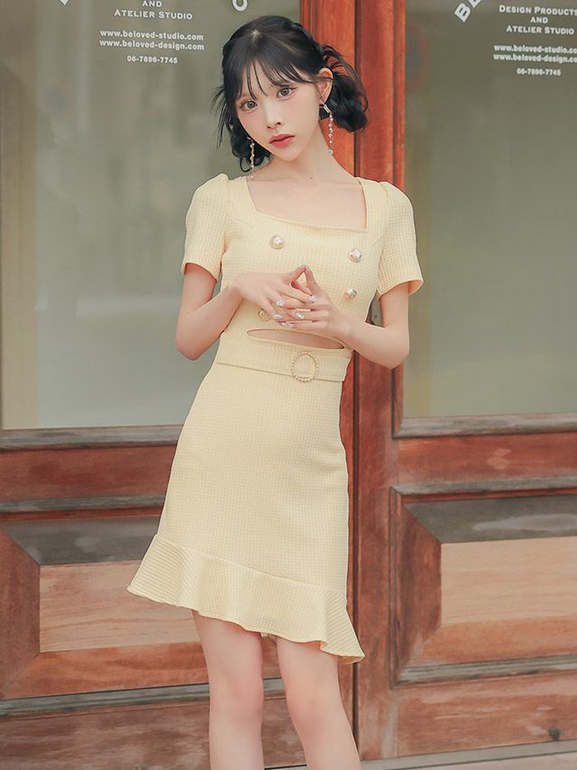 韓国ドレス ワンピース タイト ミニドレス シンプル ストレッチ 半袖 ウエストカット パフスリーブ ウエストベルト ブラジャーのまま スクエアネック ゴールドボタン ワッフル 裾フリル イエロー タイト ミニドレスのサイズ表