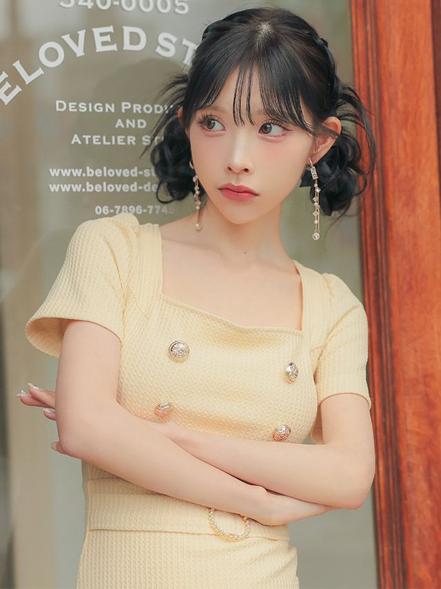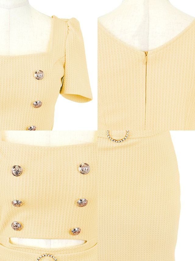 メイン画像 キャバドレス 韓国 ワンピース タイト ミニドレス シンプル ストレッチ 半袖 ウエストカット パフスリーブ ウエストベルト ブラジャーのまま スクエアネック ゴールドボタン ワッフル 裾フリル イエロー タイト ミニドレス (緩苺着用) [tk-mdk5095]