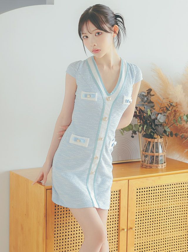 4. [ゲリラセール] [韓国ドレス] ツイードバイカラーゴールドボタン半袖タイトミニドレス (Sサイズ~Lサイズ) (緩苺/キャバドレス着用) [TikaPimil]