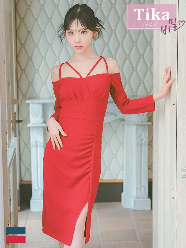 色気たっぷりなお顔周りに♪ [韓国ドレス] オフショルダー コードデザイン ワンカラー 袖あり 長袖 ストレッチ ギャザー スリット タイト 膝丈ドレス (Sサイズ~Lサイズ) (緩苺/キャバドレス着用) [TikaPimil]