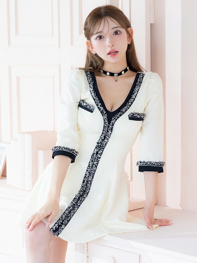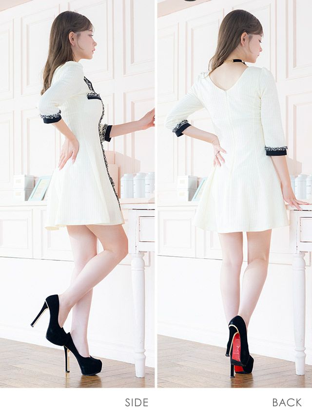 4. [韓国ドレス] 異素材 モノトーン 袖あり 七分袖 ツイード フレアミニドレス (Sサイズ~Lサイズ) (黒崎みさ/キャバドレス着用) [TikaPimil]