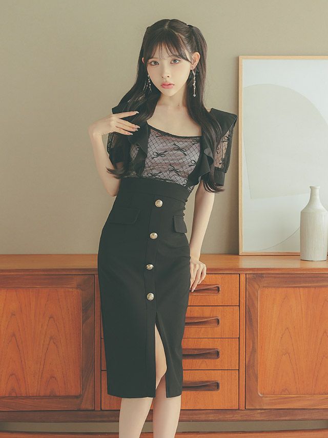 大人可愛いお洒落デザイン♪ [韓国ドレス] サロペット風半袖シアーリボンフロントボタン膝丈ドレス (Sサイズ~Lサイズ) (緩苺/キャバドレス着用) [TikaPimil]