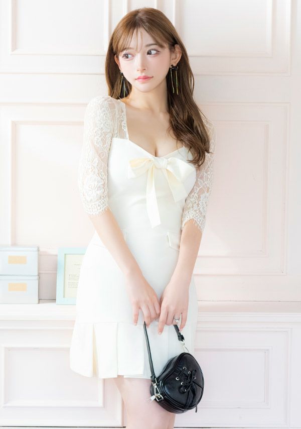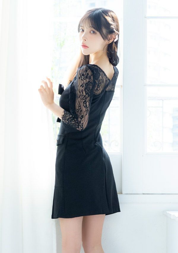 [韓国ドレス] 袖あり 七分袖 レース切り替え バストリボン ボックスプリーツ フレアミニドレス (Sサイズ~Lサイズ) (緩苺/キャバドレス着用) [TikaPimil]