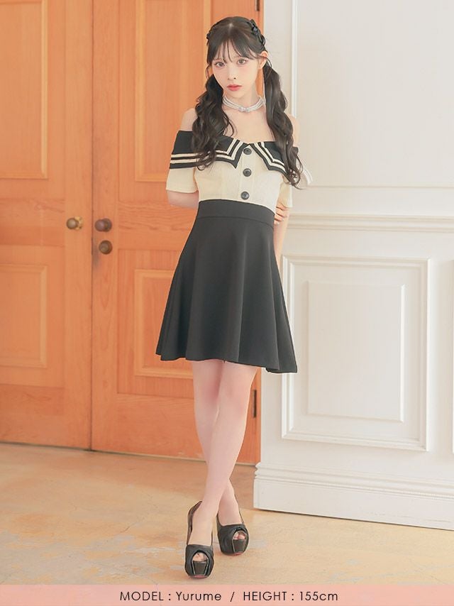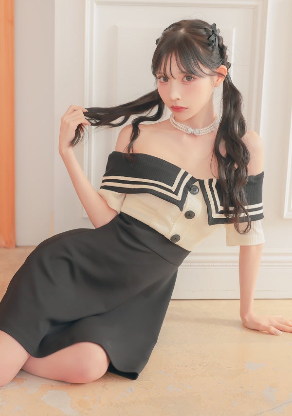 3. [韓国ドレス] ミニドレス 襟付き セーラーカラー オフショルダー バイカラー Aライン キャバドレス (緩苺着用) [tk-mdk5011]