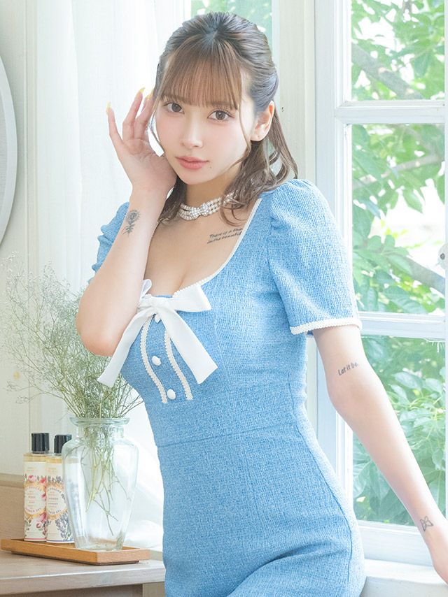 ワンピース タイト ミニドレス 上品 ストレッチ 半袖 ネックリボン パフスリーブ ブラジャーのまま 裾フリル スクエアネック パイピングレースのカラーバリエーション