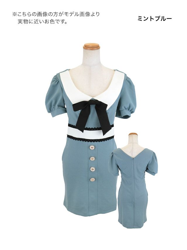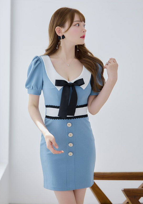 [韓国ドレス] ネックリボン 襟付き 半袖 パフスリーブ フロントボタン ストレッチ タイトミニドレス (Sサイズ~Lサイズ) (黒崎みさ/キャバドレス着用) [TikaPimil]