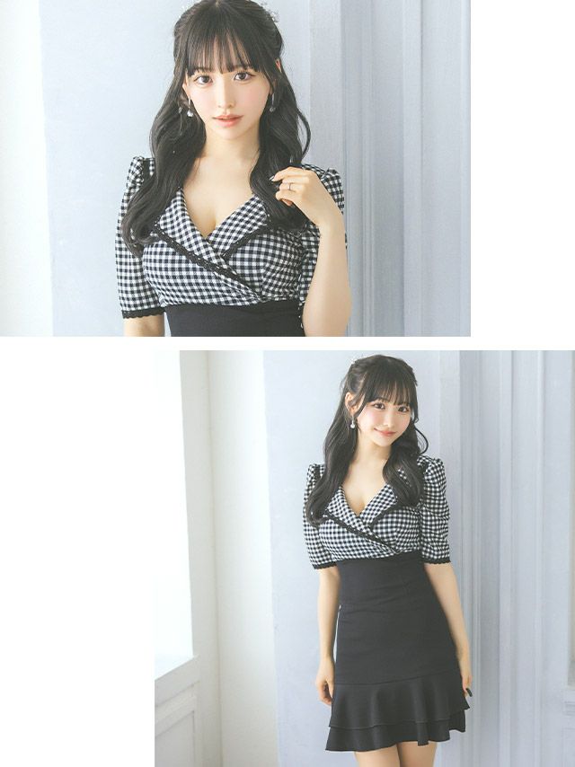 モノトーンカラーで大人ガーリーに♪ [韓国ドレス] 袖あり ギンガムチェック柄 カシュクール 襟付き 裾フリル フレアミニドレス (Sサイズ~Lサイズ) (重川茉弥/キャバドレス着用) [TikaPimil]