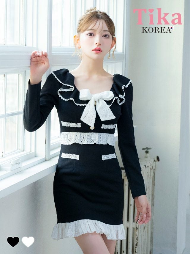 5. [韓国ドレス] ミニドレス ワンピース 長袖 パイピングレース 裾フリル モノトーン タイト キャバドレス (黒崎みさ着用) [tk-mdk917a]