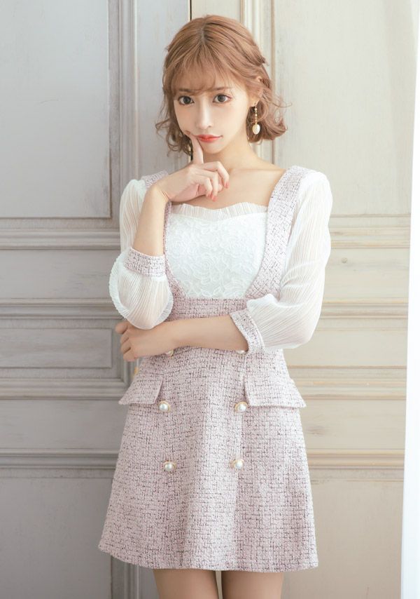 5. [韓国ドレス] ミニドレス サロペット ガーリー ツイード シフォン 袖あり 七分袖 Aライン ワンピース キャバドレス (明日花キララ着用) [tk-mdkj-058a]