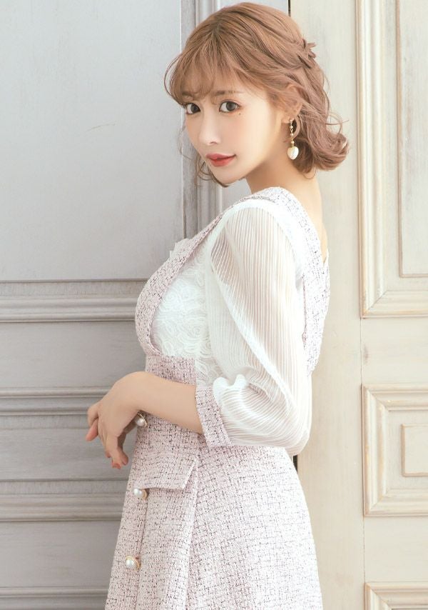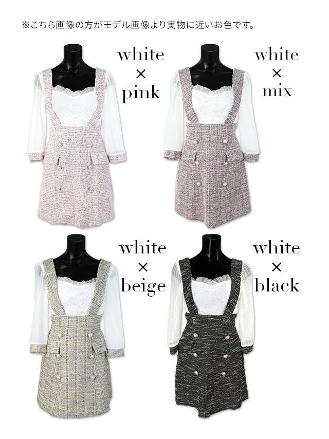 4. [韓国ドレス] ミニドレス サロペット ガーリー ツイード シフォン 袖あり 七分袖 Aライン ワンピース キャバドレス (明日花キララ着用) [tk-mdkj-058a]