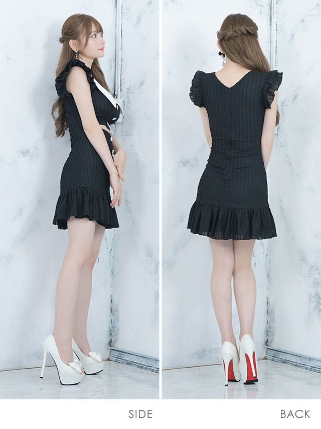 4. [韓国ドレス] ミニドレス コットンレース ワンピース セーラー襟 フリル袖 ウエストカット 裾フリル ノースリーブ ブラジャーのまま Aライン 黒 キャバドレス (黒崎みさ着用) [tk-mdkj-346a]