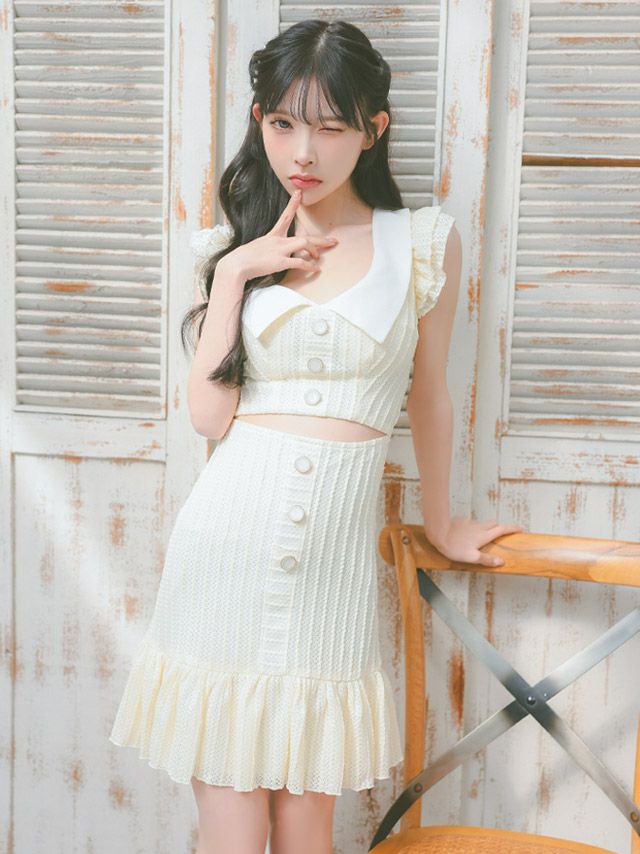 キャバドレス 韓国 ミニ丈 大きいサイズ ワンピース キャバクラ 襟付きフリル袖ウエストカットアウトコットンレース裾フリルガーリータイトミニドレス