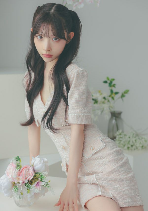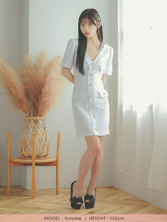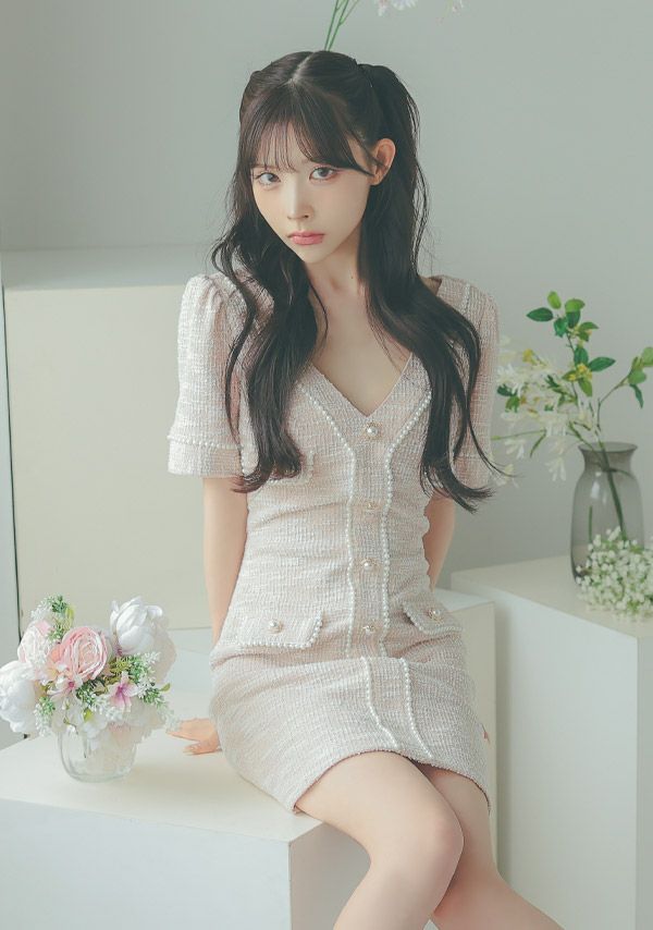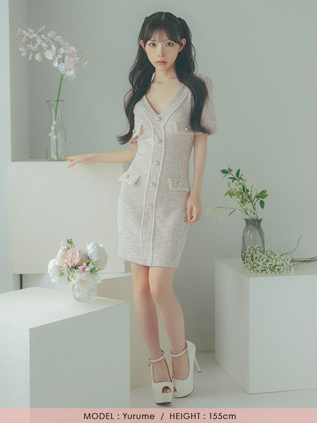 4. [韓国ドレス] ミニドレス ストレッチニット Vネック パールボタン 半袖 タイト キャバドレス (緩苺着用) [tk-mdkss15a]