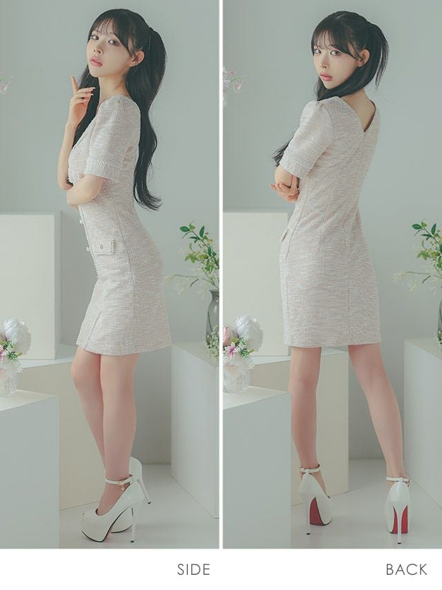 5. [韓国ドレス] ミニドレス ストレッチニット Vネック パールボタン 半袖 タイト キャバドレス (緩苺着用) [tk-mdkss15a]