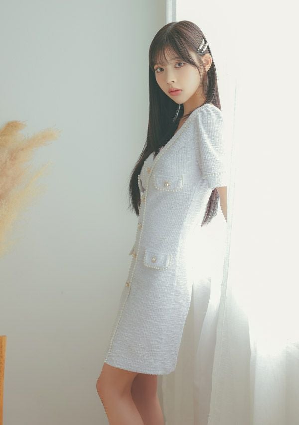 3. [韓国ドレス] ミニドレス ストレッチニット Vネック パールボタン 半袖 タイト キャバドレス (緩苺着用) [tk-mdkss15a]