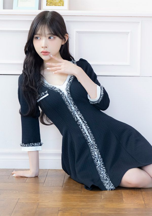 3. [韓国ドレス] ミニドレス ワンピース 異素材 モノトーン 袖あり 七分袖 ツイード Aライン キャバドレス (緩苺着用) [tk-mdkwt-2077a]