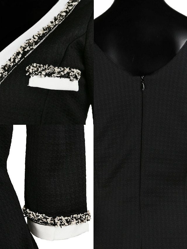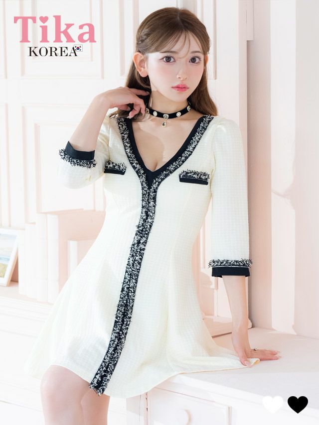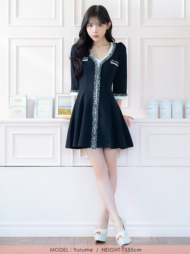 5. [韓国ドレス] ミニドレス ワンピース 異素材 モノトーン 袖あり 七分袖 ツイード Aライン キャバドレス (緩苺着用) [tk-mdkwt-2077a]
