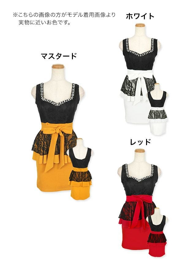 デコルテビジューウエストリボンレースペプラム切替ノースリーブタイトミニドレス の商品詳細1