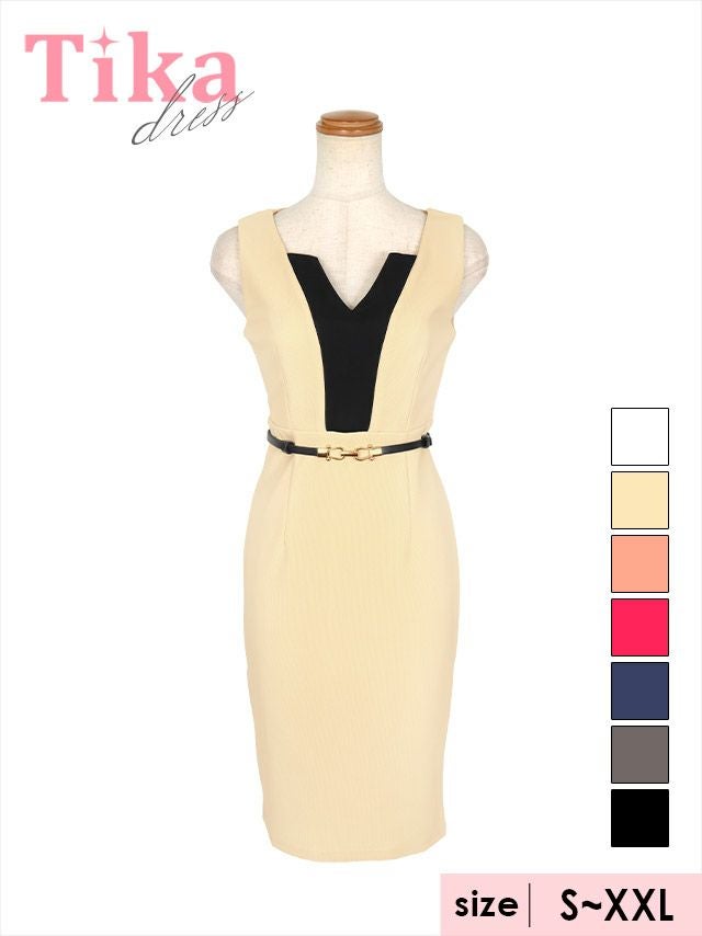 キャバドレス ミニ丈 大きいサイズ キャバクラ Tika ティカ ウエストベルト付きバイカラーVネックノースリーブタイトミニドレス