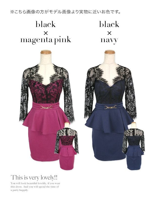 3. 袖ありVネックフラワーレースベルト付きペプラムタイトミニドレス (Sサイズ~XXLサイズ) (黒崎みさ/キャバドレス着用)