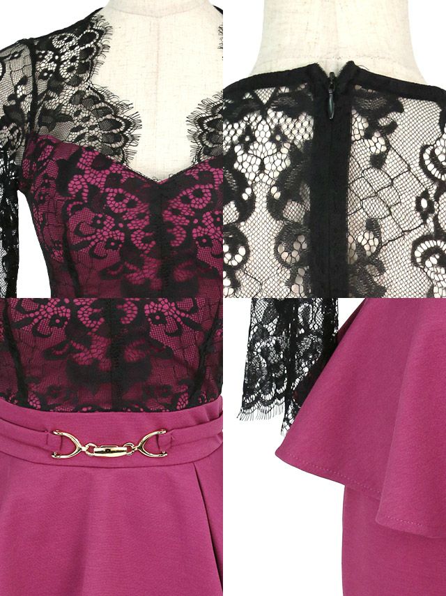 袖ありVネックフラワーレースベルト付きペプラムタイトミニドレスのカラーバリエーション