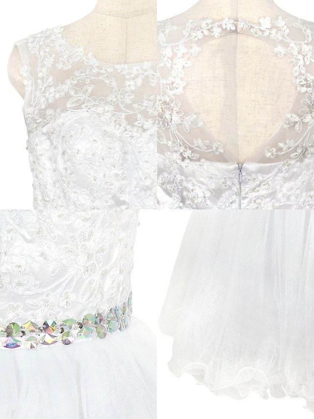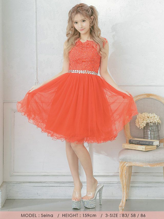 女の子のとびっきり可愛いを演出♪ ノースリーブフラワー刺繍バックハートカットアウトウエストビジューラインボリュームチュールフレアミニドレス (Sサイズ~Lサイズ) (志田愛佳/キャバドレス着用)
