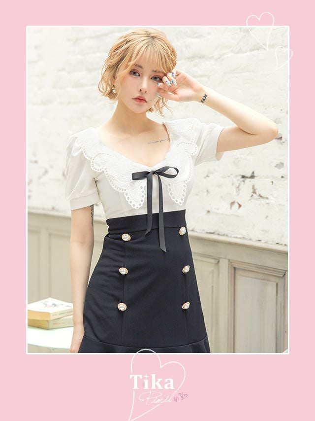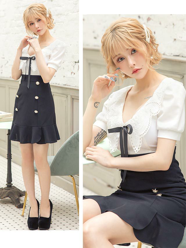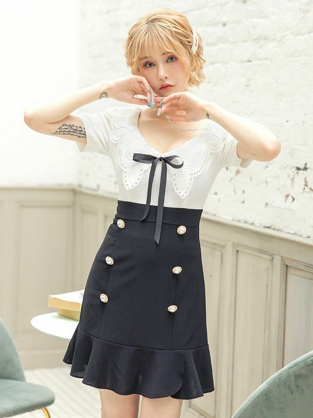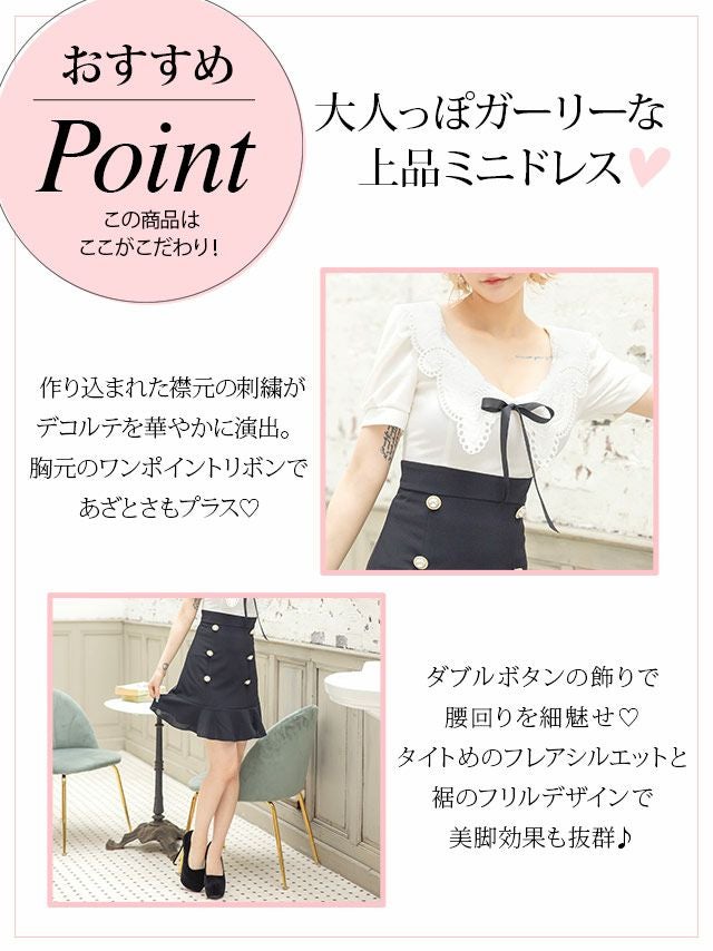 [韓国ドレス] 刺繍レース襟半袖フレアミニドレス (Sサイズ~Lサイズ) (戦慄かなの/キャバドレス着用)