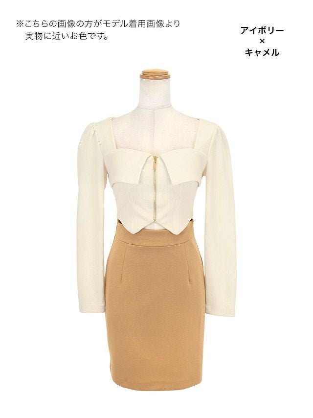 都会的な大人女性に導く♡ [韓国ドレス] ミニドレス タイト 長袖 谷間 ジップ ストレッチ スクエアネック ウエストカット ニット バイカラー アイボリー キャメル キャバドレス (uka着用)