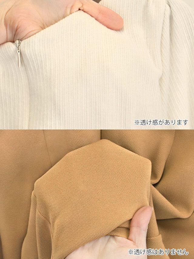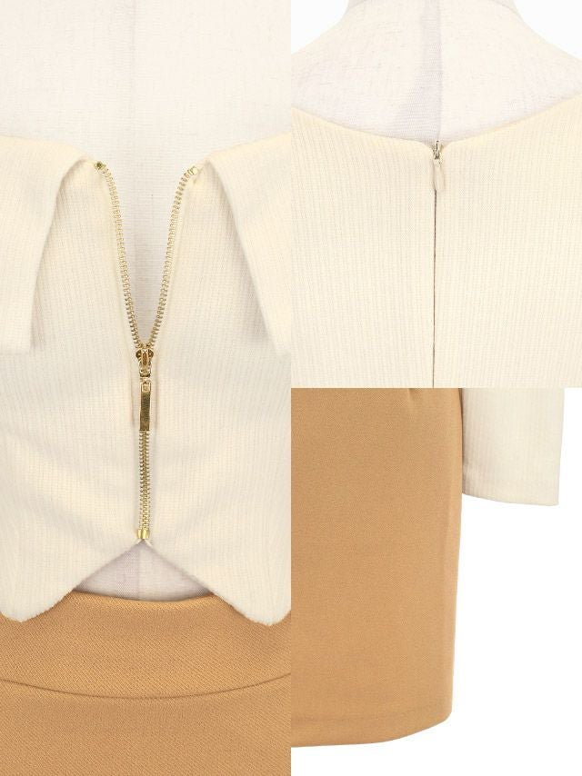 4. [韓国ドレス] ミニドレス タイト 長袖 谷間 ジップ ストレッチ スクエアネック ウエストカット ニット バイカラー アイボリー キャメル キャバドレス (uka着用)