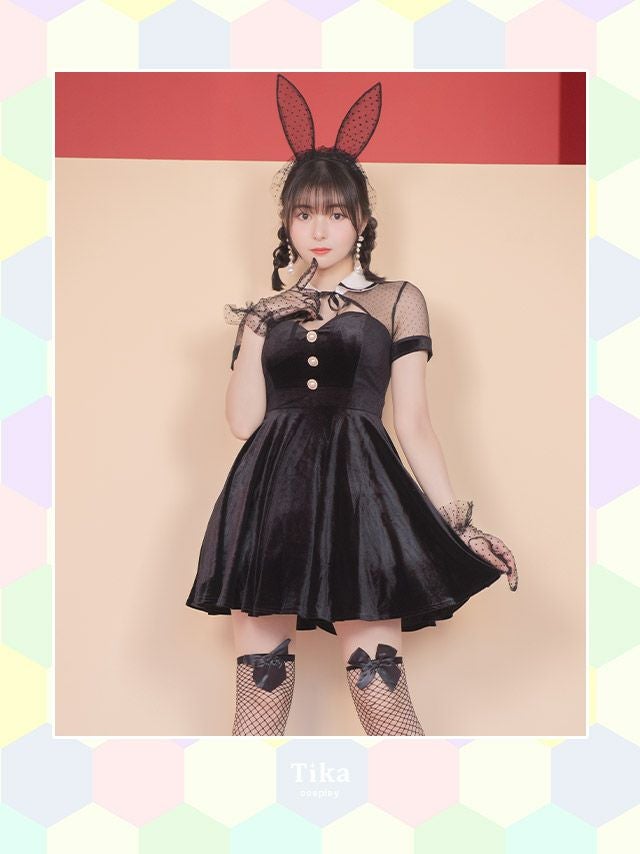 甘すぎないレトロチックなバニーちゃん♪ [コスプレ] イースター ベロア体型カバーフレアスカートドットシアーモノトーンガーリーバニー [5点セット] (ワンピース/カチューシャ/手袋/網ニーハイ/しっぽ)