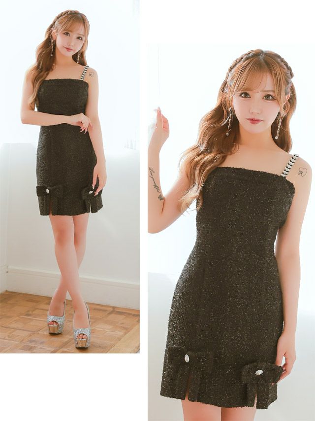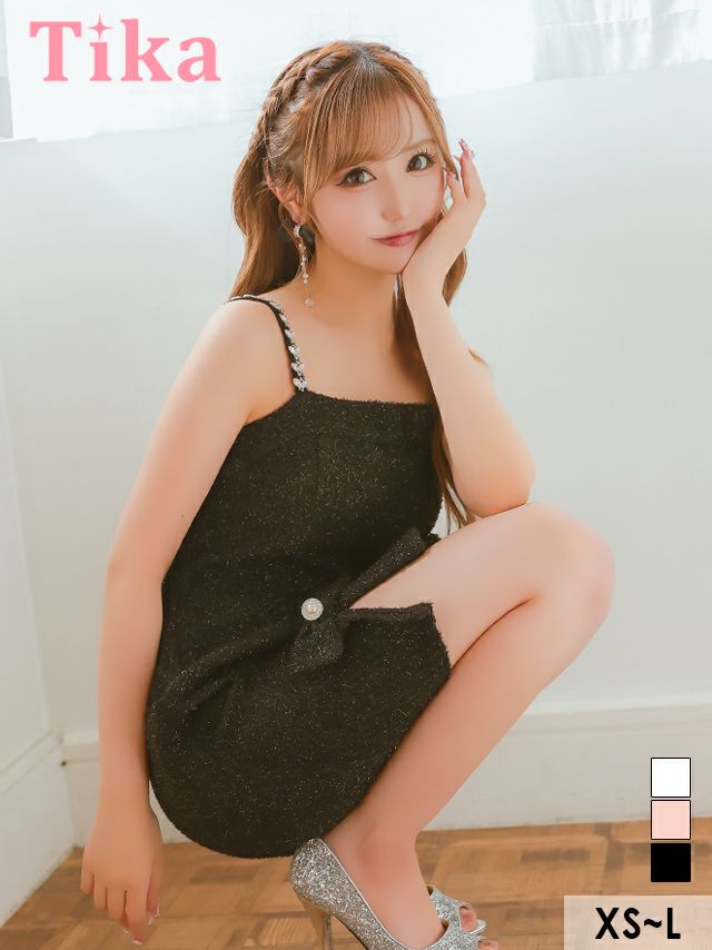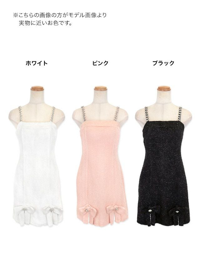 3. [SALE] チェーン キャミソール ツイード ラメリボン ワンカラー ガーリー フレアミニドレス (Sサイズ~Lサイズ) (重川茉弥/キャバドレス着用)