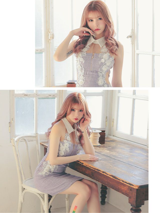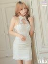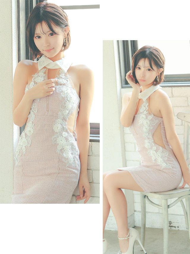 3. [SALE] ホルターネック 襟付き 3Dツイード フラワー刺繍 バストジップ ヌーディーシアー くびれ タイトミニドレス (Sサイズ~Lサイズ) (聖菜/キャバドレス着用)