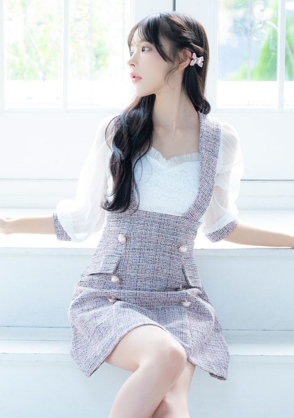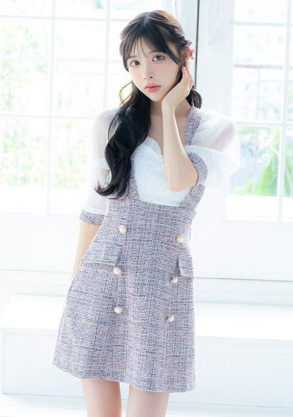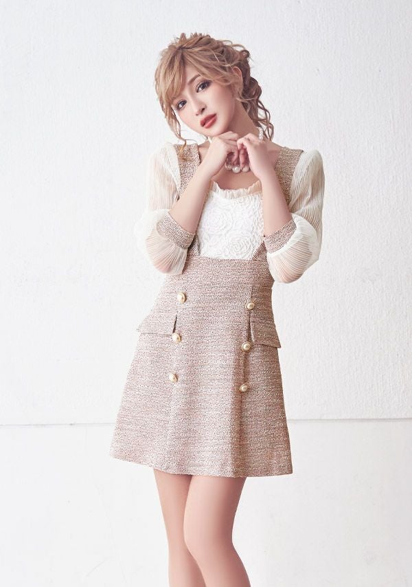 5. [韓国ドレス] ミニドレス サロペット ガーリー ツイード シフォン 袖あり 七分袖 Aライン ワンピース キャバドレス (黒崎みさ着用) [tk-mdkj-058b]