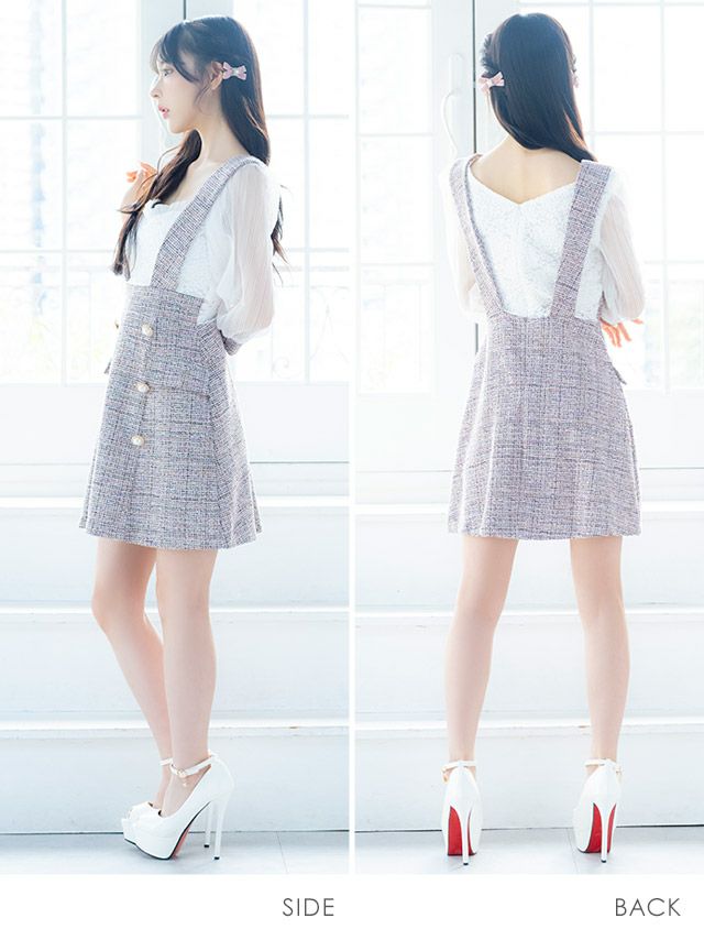 4. [韓国ドレス] ミニドレス サロペット ガーリー ツイード シフォン 袖あり 七分袖 Aライン ワンピース キャバドレス (黒崎みさ着用) [tk-mdkj-058b]